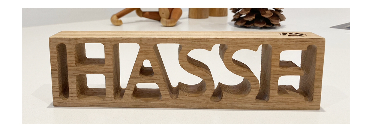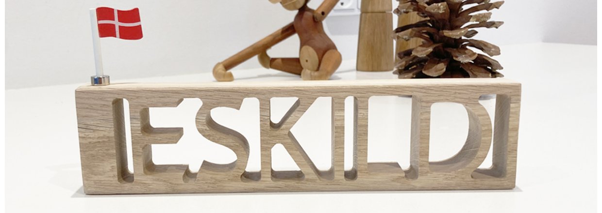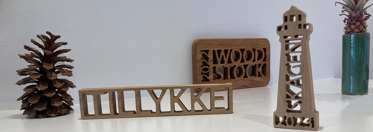 Du staver teksten: Vi skærer den ud fra en planke af egetræ og sender den til dig fragtfrit.